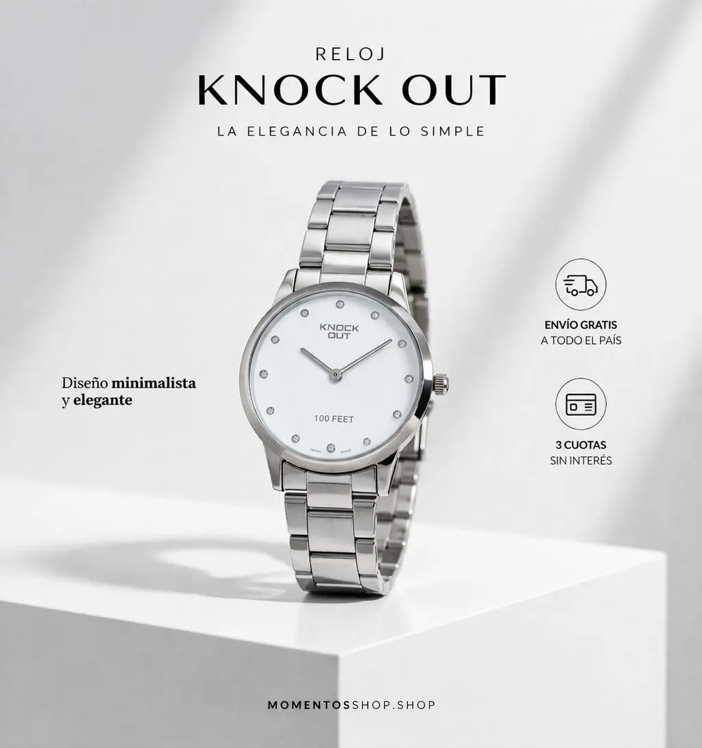 El Reloj Knock Out combina un diseño minimalista con acabado plateado y esfera blanca, logrando un estilo limpio, moderno y versátil que se adapta a cualquier ocasión.