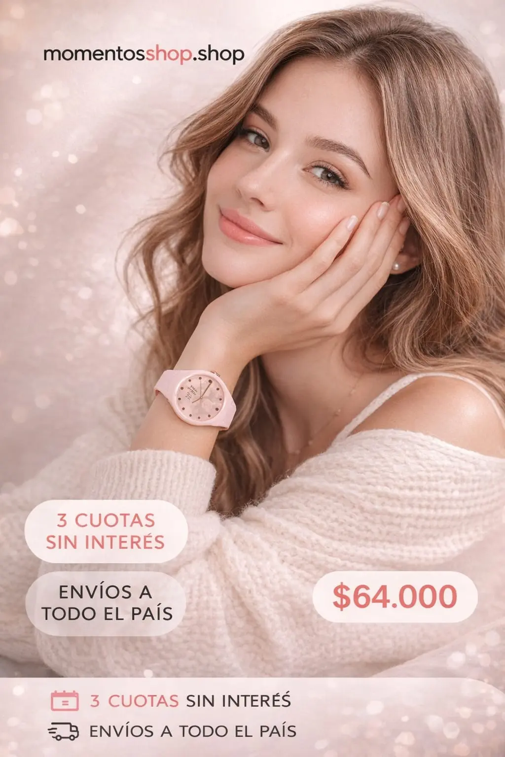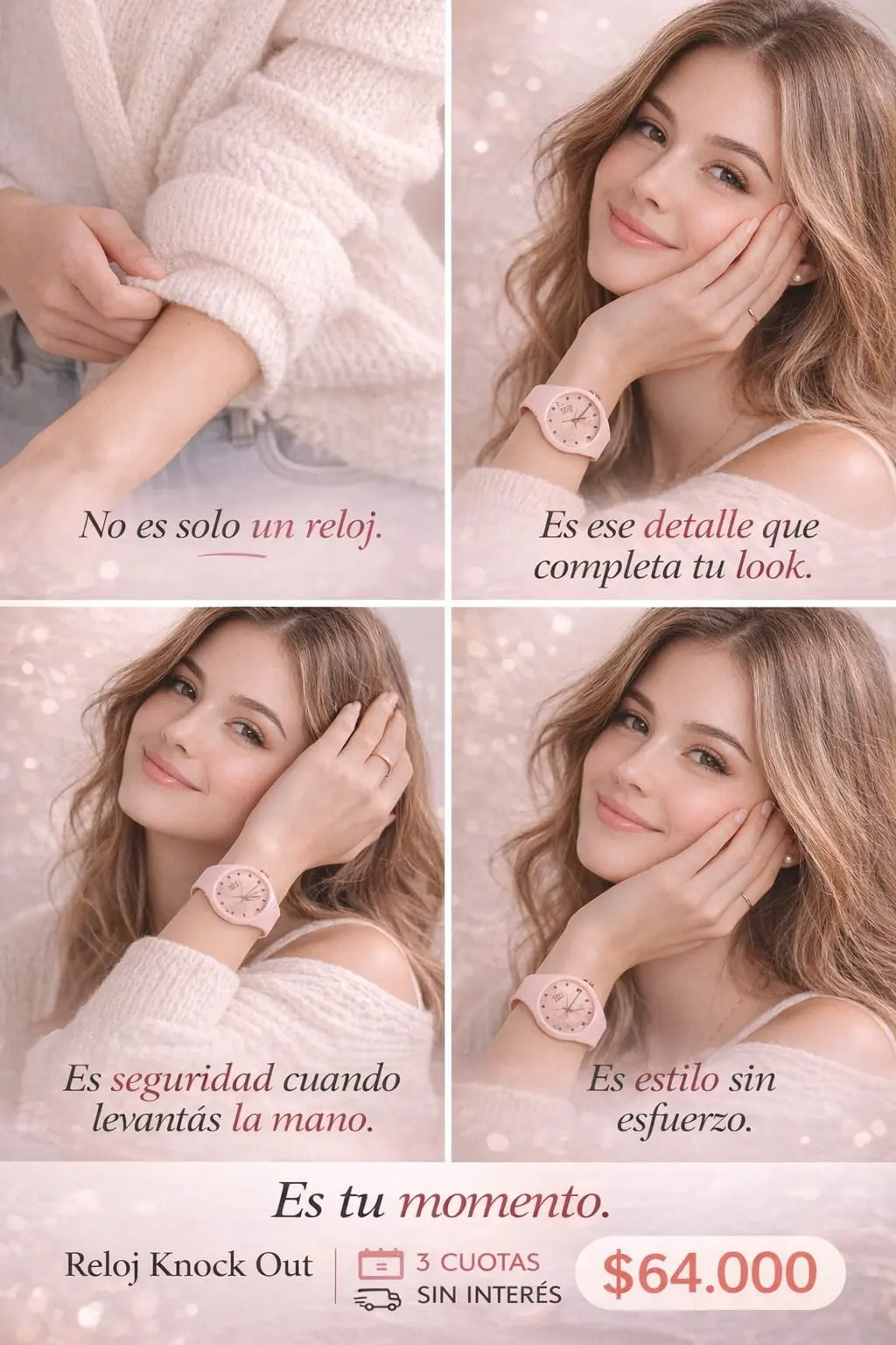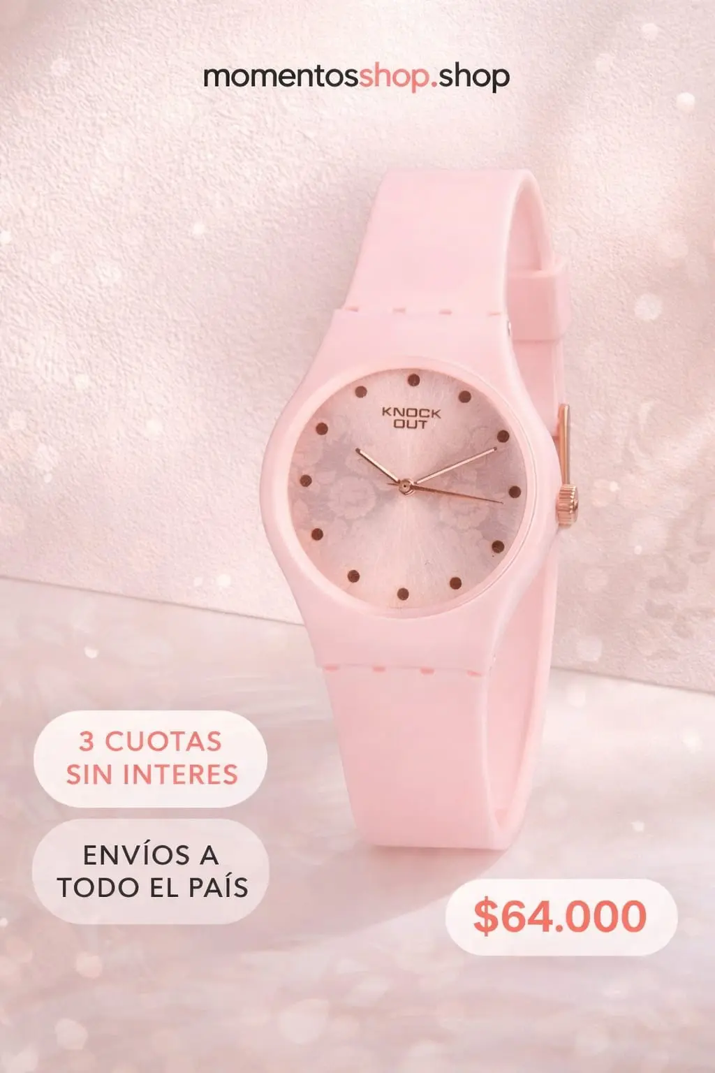 El reloj knock out rosa fue diseñado para mujeres que entienden que los detalles hacen la diferencia. su estética minimalista y femenina lo convierte en un accesorio versátil que acompaña tanto loocks casuales como mas sofisticados. su malla de silicona aporta comodidad durante todo el día , es liviano practico y fácil de combinar